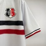 A nova camisa reserva do Santa Cruz traz a cor branca predominante com duas faixas na região do peito, a primeira preta, a segunda vermelha, com bordas na mesma cor e na parte interna, são vistos elementos em tom sobre tom, que remetem à literatura de cordel.