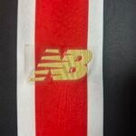A gola é V na cor vermelha e ganha nas laterais filetes dourados, cor que também aparece nos punhos, complementando as mangas vermelhas.