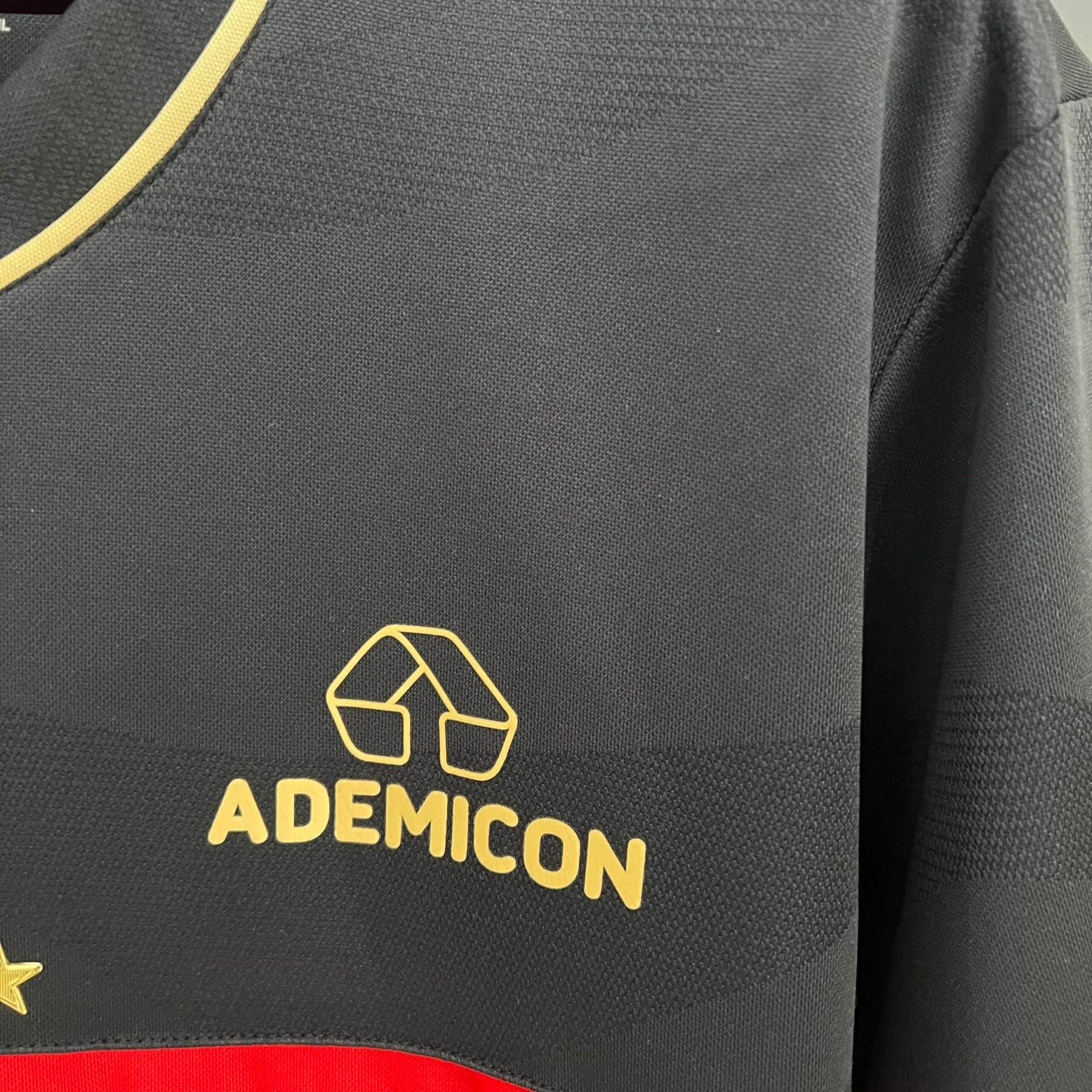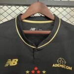 O modelo traz gola padre em ribana com fechamento por botão e aplicação de detalhes dourados nas mangas e no colarinho. A tradicional faixa tricolor aparece em destaque no peito, enquanto o escudo do clube é acompanhado pelo logo da New Balance e pelos patrocinadores em dourado. As estrelas, o selo na barra lateral e o logotipo da fornecedora também surgem em acabamento cromado.