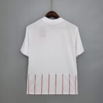 A camisa titular traz um modelo bastante simples, baseado em um template da Nike. O manto é predominantemente branco e traz finas linhas verticais vermelhas ao longo do corpo do manto.