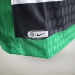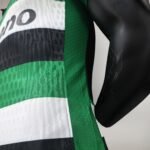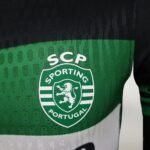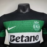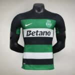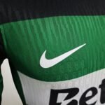O escudo do Sporting é aplicado no lado esquerdo do peito, numa versão verde e branca, enquanto o logo da Nike aparece em verde, no lado direito. O patrocínio máster da Betano é visto em preto.