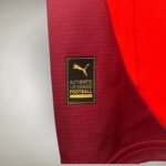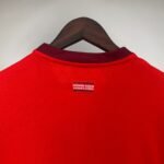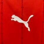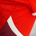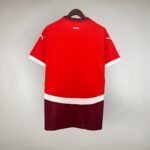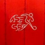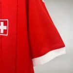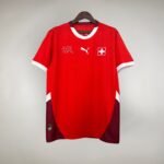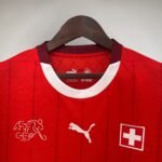 A camisa titular da Suíça é vermelha e traz como destaque, finas linhas verticais em grená que percorrem o corpo do manto, representando as tradicionais roupas suíças com detalhes que trazem inspiração nas flores “edelweiss”, bastante comum nos Alpes.