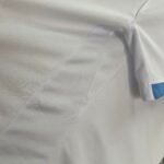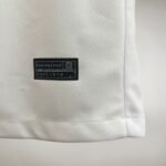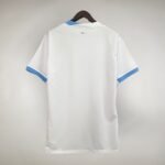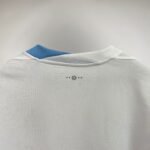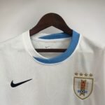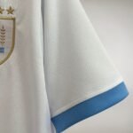 A nova camisa reserva do Uruguai é branca e traz gola redonda, metade celeste, metade branca, enquanto os punhos aparecem em azul celeste.