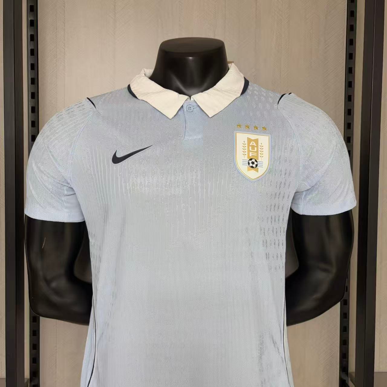 A Nike estampa o Swoosh em preto no lado direito do peito, enquanto o escudo da Associación Uruguaya de Fútbol vai no lado esquerdo, em branco e dourado, com as quatro estrelas acima, na mesma cor.