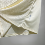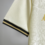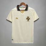 A camisa de jogo é off-white e traz como destaque um padrão em jacquard frontal que reproduz azulejos presentes em São Januário.A gola é polo na cor preta com friso dourado, cor que é vista em detalhes triangular frontal.