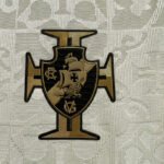 O escudo é aplicado com o fundo dourado e linhas pretas que homenageia o escudo presente na estátua de Vasco da Gama presente na entrada da social de São Januário.