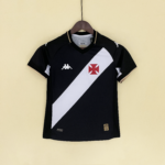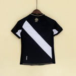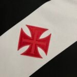 A camisa titular do Vasco da Gama é preta e traz gola V com a parte frontal também preta e a nuca trazendo a cor dourada junto ao preto.