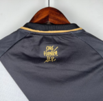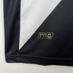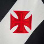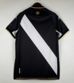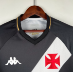 A camisa titular do Vasco da Gama é preta e traz gola V com a parte frontal também preta e a nuca trazendo a cor dourada junto ao preto.