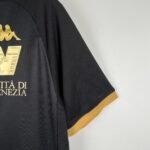 A camisa titular do Venezia FC é preta e traz gola redonda na cor dourada com botão frontal. A cor dourada também é vista nos punhos e na aplicação do escudo, no lado esquerdo. O logo da Kappa ganha a mesma cor e também está no lado esquerdo, aplicado acima, enquanto abaixo está o patrocínio máster “Città Di Venezia”, que divulga o turismo na histórica cidade.