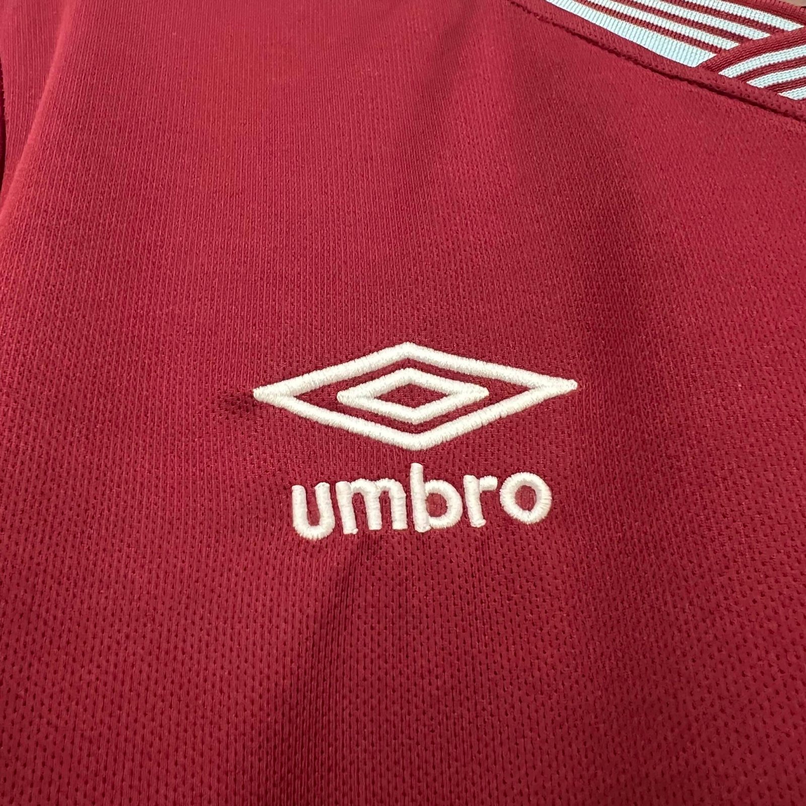 A nova camisa titular do West Ham é grená e traz gola V com frisos em grená e azul celeste, padrão que é repetido nos punhos.