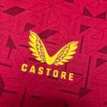 O escudo dos Wolves é aplicado no lado esquerdo do peito, enquanto o logo da Castore aparece no lado direito, e nas mangas, em amarelo. O patrocínio máster e o de manga, por sua vez, são aplicados em branco.