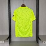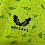 O ombro direito exibe o número 66 acompanhado da letra C, que se refere aos patrocinadores do clube. A gola simples e amarela mantém a coesão do design, enquanto o símbolo da Castore é repetido em ambos os lados das mangas, garantindo uma aparência equilibrada e elegante.