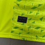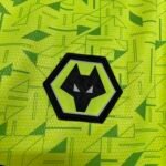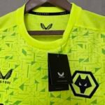A camisa de goleiro do Wolverhampton Wanderers para a temporada de 2023 se destaca por seu vibrante amarelo fluorescente, complementado por detalhes em preto. No lado esquerdo do peito, o distintivo da Castore em preto contrasta com a base amarela, enquanto o emblema do clube, um lobo em um escudo hexagonal, adorna o lado direito.